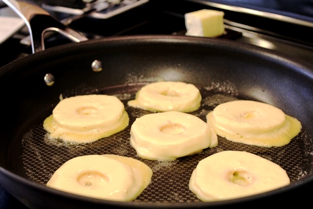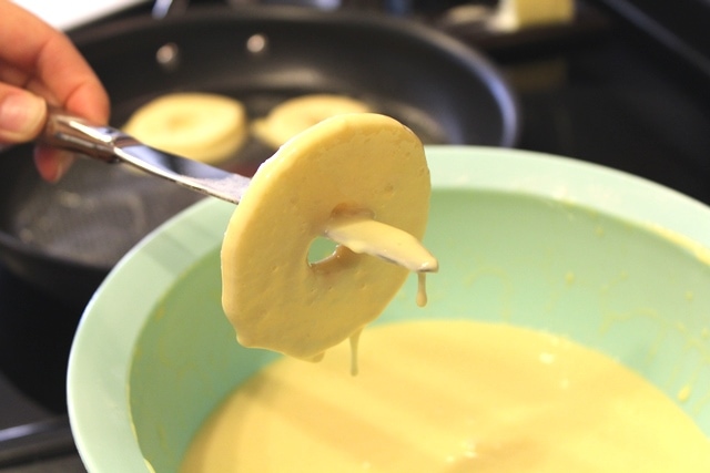 The recipe is a simple crepe-style dough in which you dip whole apple slices, then cook them.