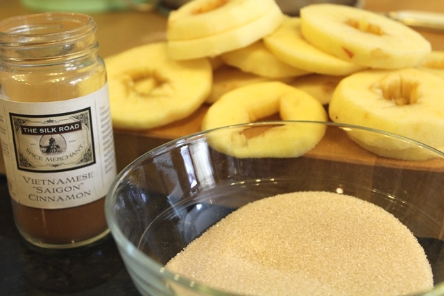 Then, cut into approximately 1/2-inch slices – for me each apple gave me about 6 slices.