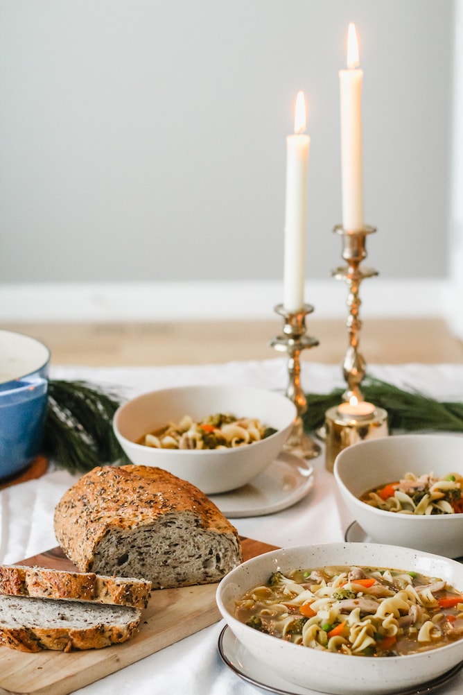 Chicken Soup sounds so good right now, and this looks so good, Jessica! What a great idea to have a soup and bread party. I love the simplicity and comfort of it. Cheers!