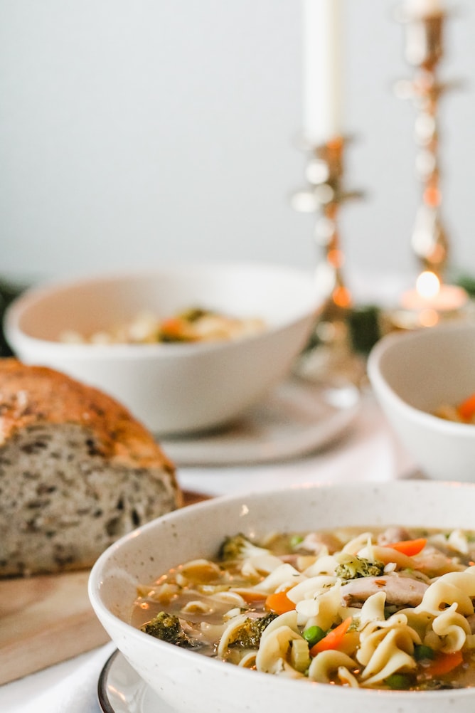 I love getting together for easy-going meals where we can enjoy each other’s company over great food. This Chicken Noodle Soup packs a ton of flavour and most of the recipe time is spent at the beginning prepping the ingredients.