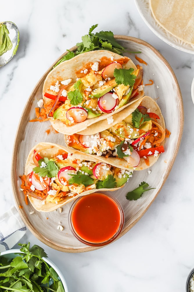 My favourite way to make these tacos is leaning towards other ingredients I like to eat with breakfast like sweet potato and avocado. So really, let your personal tastes guide you.