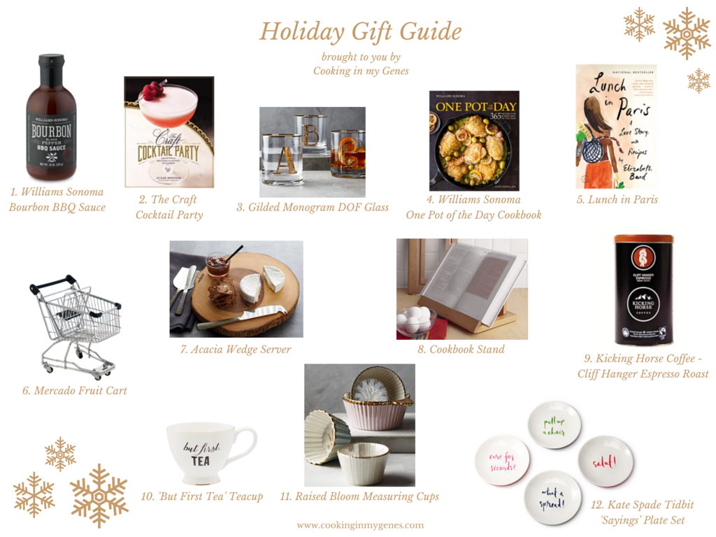 1. Williams Sonoma Bourbon BBQ Sauce / 2. The Craft Cocktail Party / 3. Gilded Monogram DOF Glass / 4. Williams Sonoma One Pot of the Day Cookbook / 5. Lunch in Paris – A Love Story with Recipes / 6. Mercado Fruit Cart / 7. Acacia Wedge Server / 8. Cookbook Stand / 9. Kicking Horse Coffee – Cliff Hanger Espresso Roast / 10. ‘But First Tea’ Teacup / 11. Raised Bloom Measuring Cups / 12. Kate Spade Tidbit ‘Sayings’ Plate Set